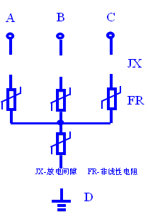 三相组合式过电压保护器(HKCBP)的电气原理如图一所示,图中FR为高能容氧化锌非线形电阻,JX为放电间隙,由于采用对称结构,其中任意三个可分别接入A、B、C三相,另一个接地线。